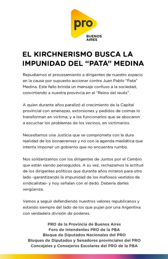 En el párrafo más duro del comunicado titulado “El kirchnerismo busca la impunidad del ‘Pata’ Medina”, el PRO expresa que “nos solidarizamos con los dirigentes de Juntos por el Cambio perseguidos y rechazamos la actitud de dirigentes políticos que durante años miraron para otro lado -garantizando la impunidad de los mafiosos vestidos de sindicalistas- y hoy señalan con el dedo. Debería darles vergüenza”.