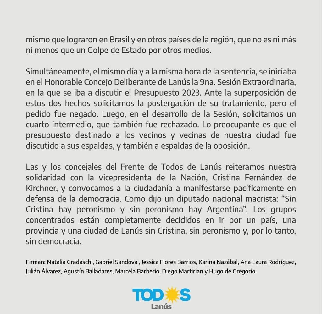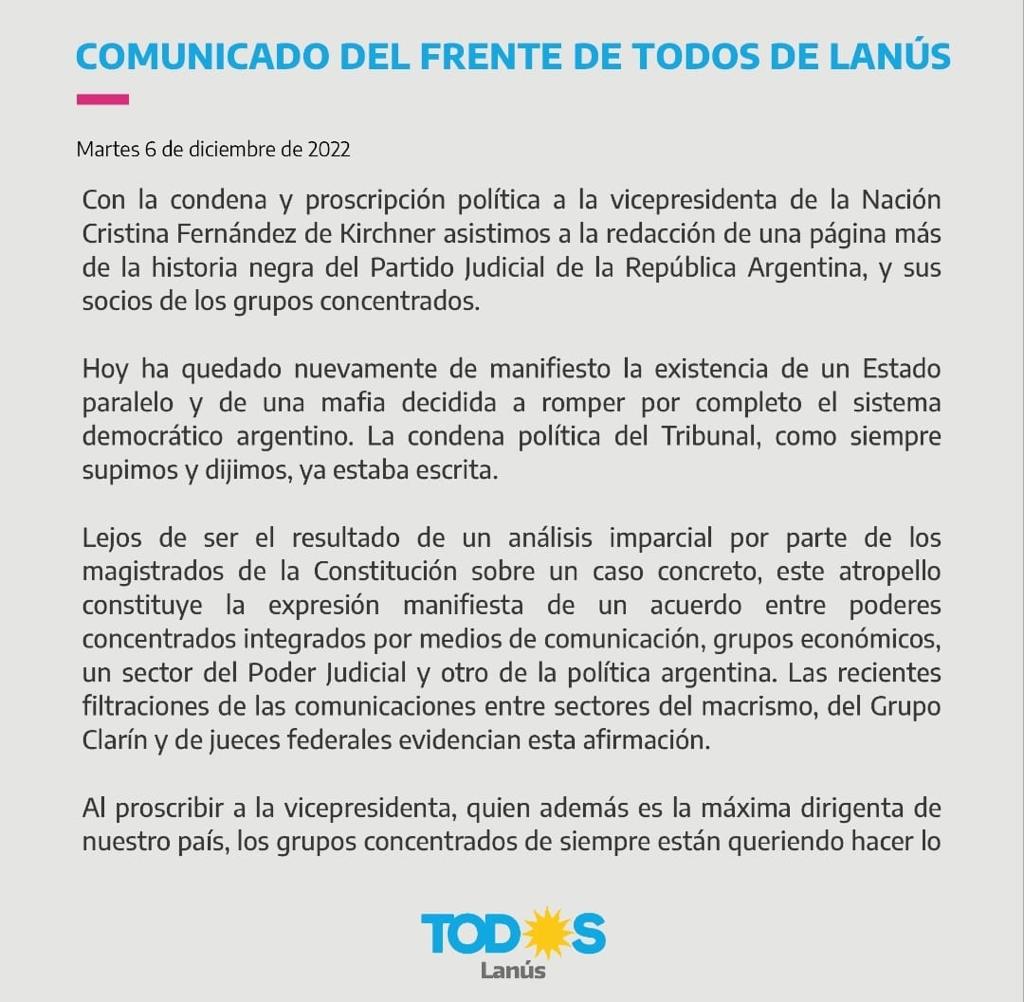 Comunicado del Frente de Todos Lanús tras la condena a Cristina Kirchner 6 de diciembre de 2022 | No Comments | Política