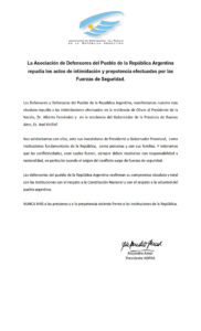 En el texto, titulado “La Asociación de Defenroes del Pueblo de la República Argentina repudia los actos de intimidación y prepotencia efectuadas por las Fuerzas de Seguridad”, manifestaron “nuestro más absoluto repudio a las intimidaciones efectuadas en la residencia de Olivos al Presidente de la