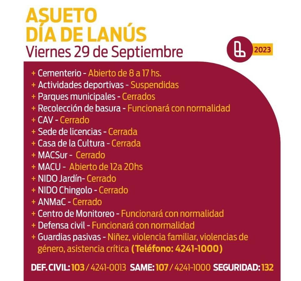 El Municipio de Lanús informa el cronograma de servicios públicos con motivo del asueto del viernes 29 de septiembre, en el cual se celebra el 79º aniversario de la autonomía del distrito.