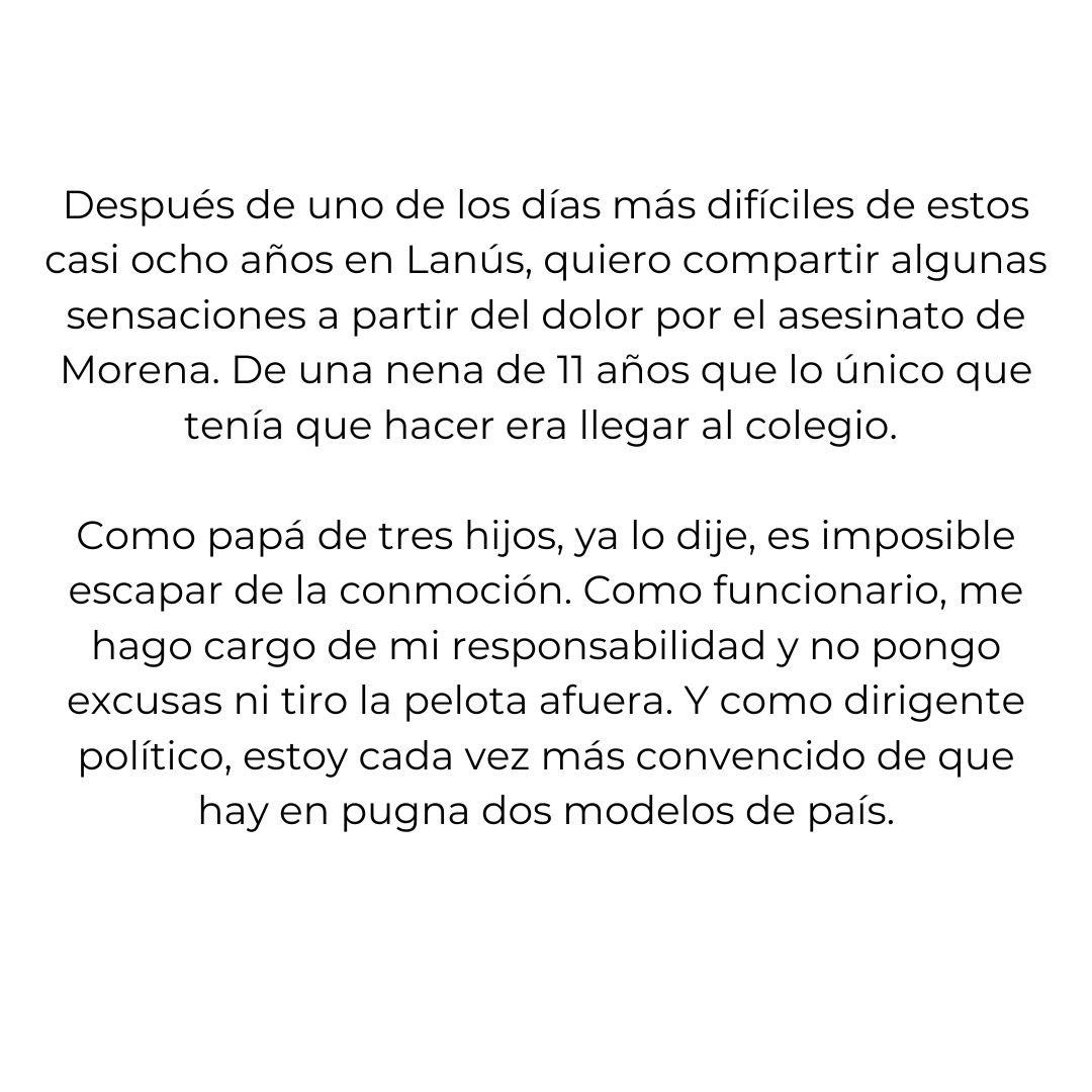 Tras admitir que escribía esa misiva “después de uno de los días más difíciles de estos casi ocho años en Lanús”, Kravetz expresó que “como papá de tres hijos es imposible escapar de la conmoción; como funcionario me hago cargo de mi responsabilidad y no tiro la pelota afuera y, como dirigente político, estoy cada vez más convencido de que hay en pugna dos modelos de país, por un lado los argentinos del estudio y del trabajo y del otro lado, los gerentes de la pobreza, los que invierten en marginalidad y defienden a los chorros”.
