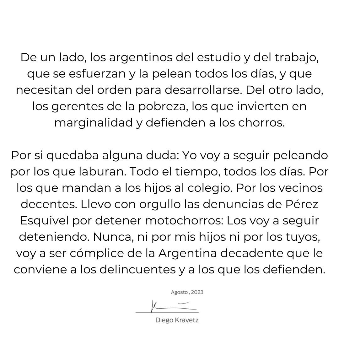 En el último de los tres párrafos de la carta a los vecinos, el funcionario declaró que “voy a seguir peleando por los que laburan. Llevo con orgullo las denuncias de (el premio Nobel de la Paz, Adolfo) Pérez Esquivel por detneer motochorros: los voy a seguir deteniendo”