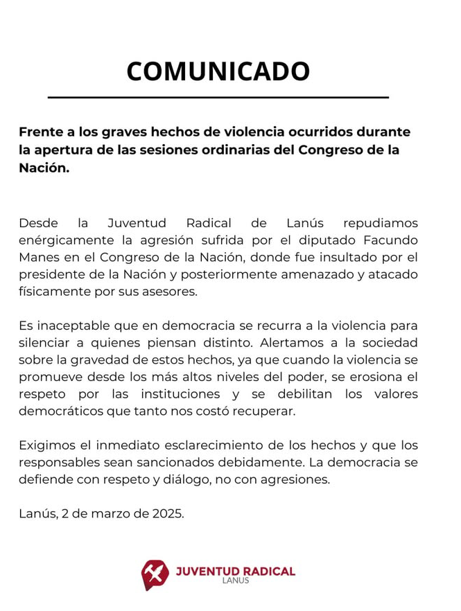 En el comunicado de repudio, los jóvenes radicales lanusenses alertaron “a la sociedad sobre la gravedad de estos hechos, ya que cuando la violencia se promueve desde los más altos niveles del poder, se erosiona el respeto por las instituciones y se debilitan los valores democráticos”.