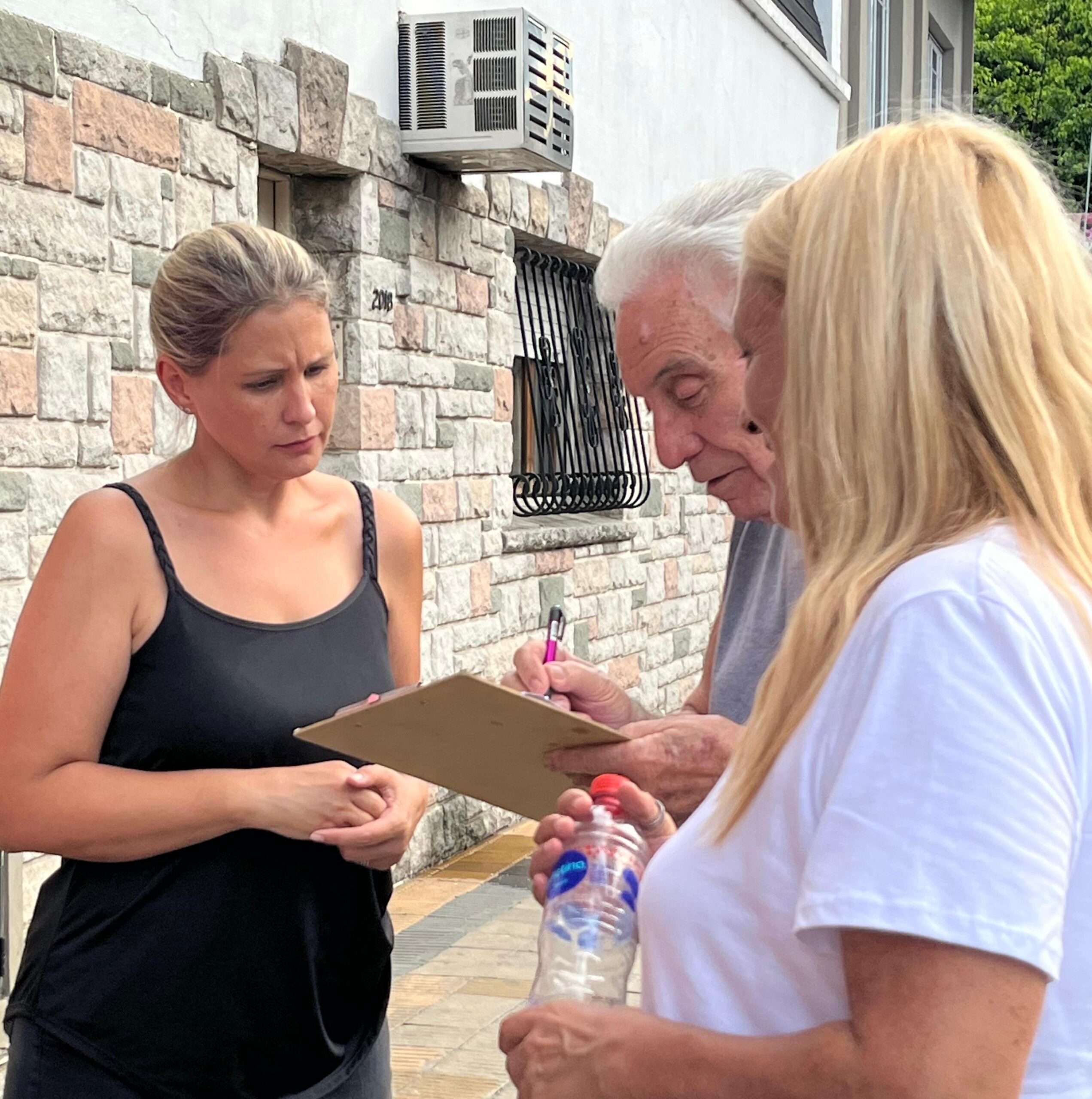 Un vecino firma el proyecto de pedido de arreglo del asfalto, junto a Werenicz y la concejal Ayesa.